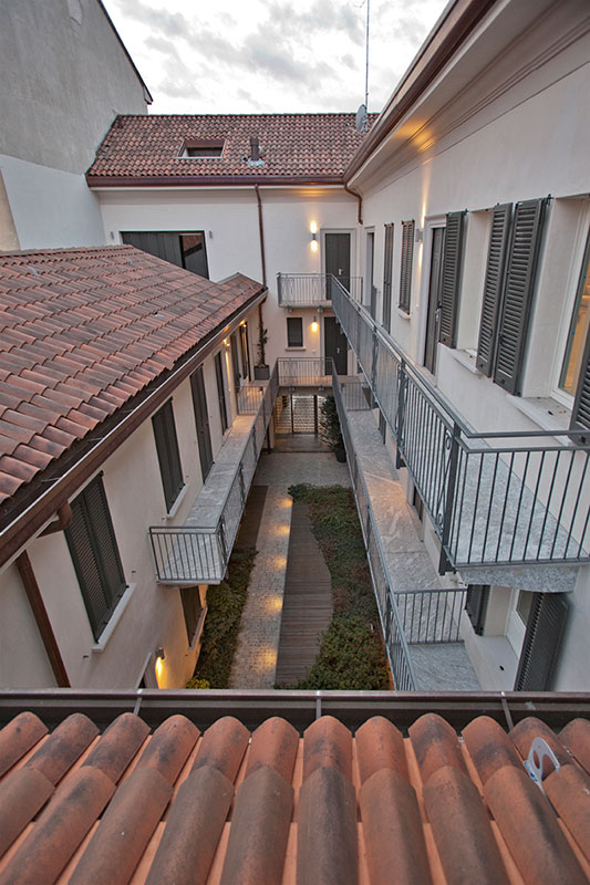 La costruzione a corte precedentemente esistente è stata in parte demolita, dando luogo alla realizzazione di prestigiosi appartamenti oltre a spazi commerciali e autorimesse poste al piano interrato.